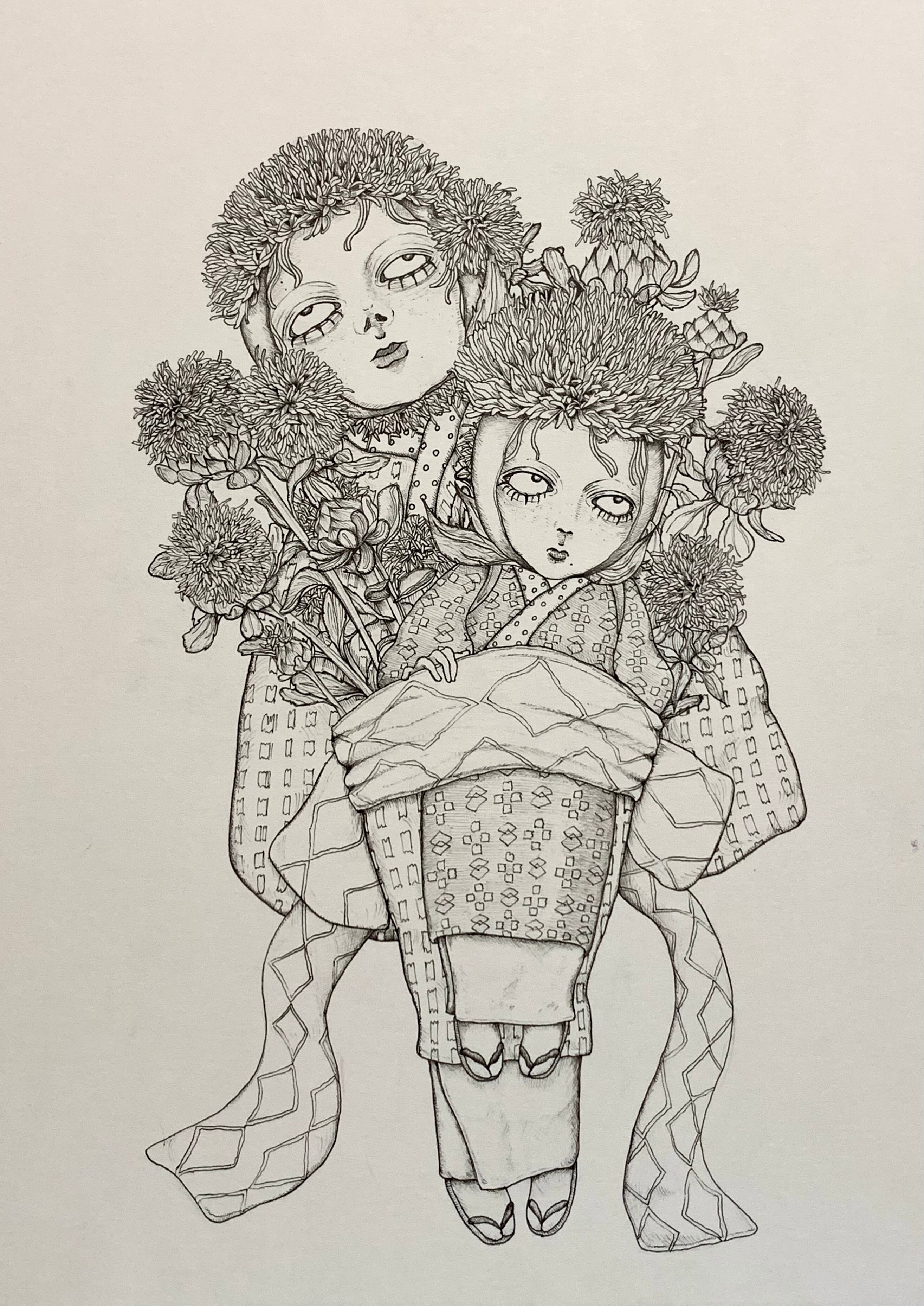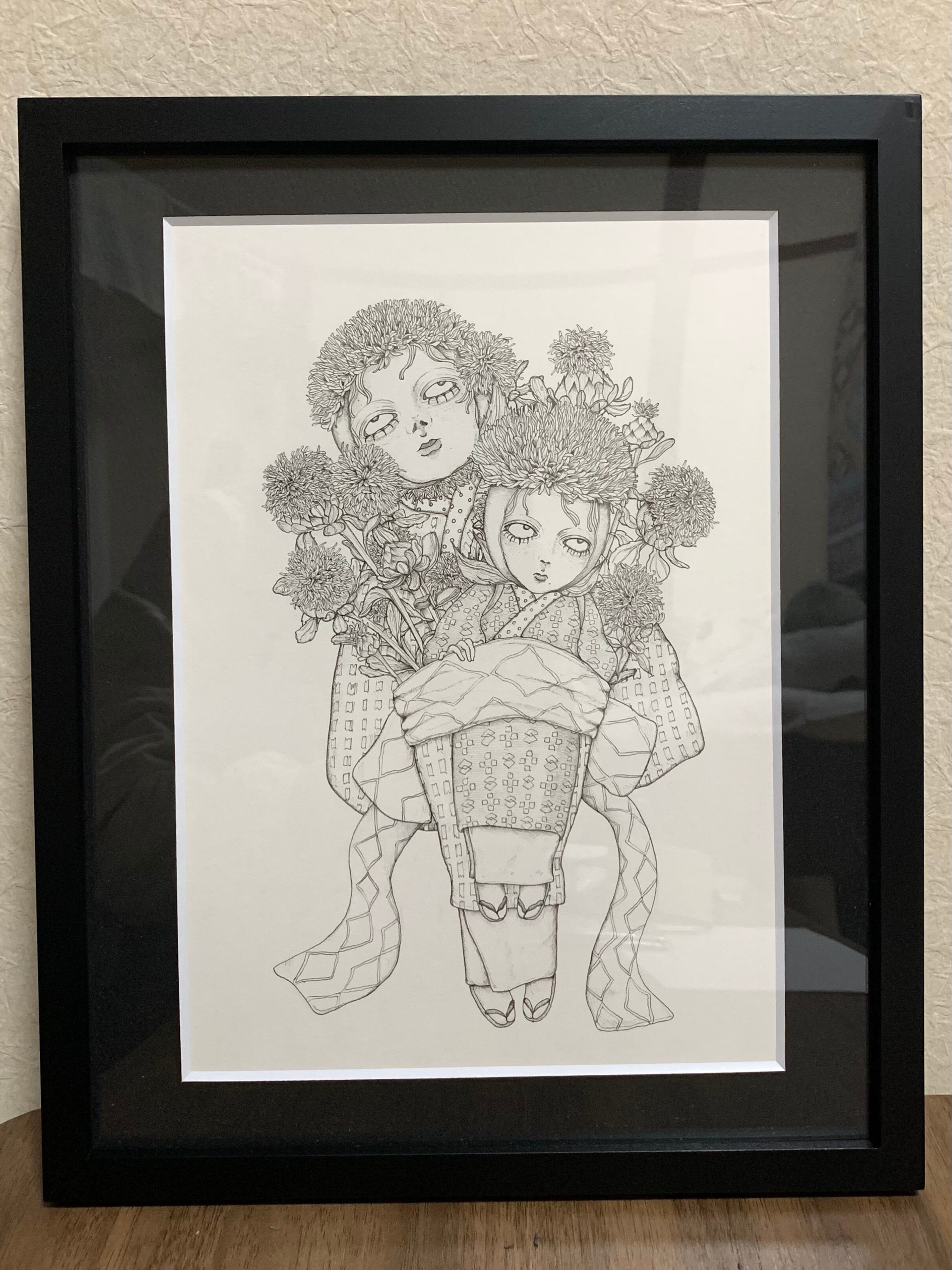 『紅花娘』いせやしおん 2025年 ミリペン/ボールペン/イラストボード 額装あり 182×257mm(B5size) 額外寸260×321×厚さ20mm